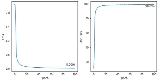 나온 결과는 상당히 놀랍다. 인공신경망은 97.6%의 정확도를 보여줬던 것에 비해 LeNet-5은 98.8프로라는 정확도를 보여줬다. 5배의 시간이 걸리긴 했지만(25분 100 epoch) 상당한 결과를 보여준다는 걸 알 수 있다.