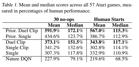 또한, Atari 벤치마크에서는 DQN, DDQN, Dueling DDQN, 그리고 PER을 적용한 성능을 비교하여 Dueling architecture이 실제 향상이 있다는 것을 증명하였다. 이 논문에서는 다른 hyperparameter은 다 같게 하고 learning rate를 조금 낮게 조정한 후에 convolution layer의 gradient을 $\frac {1}{\sqrt {2}}$로 rescale 하였다. 그리고 10 이상의 gradient를 clipping을 적용하였다. 실제로 모든 성능 향상 방법을 다 채택한 Dueling DDQN with PER이 제일 좋은 성능을 보여주는 것으로 보인다.