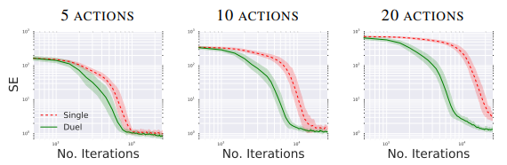 실험 결과에 따르면 Corridor이라는 실험 환경에서 Dueling DQN은 그냥 DQN보다 action의 개수가 많을 때 더 빠른 convergence를 보여주었다. 이는 공유되는 $V(s;\theta,\beta)$가 general 한 값을 학습하기 때문이다.