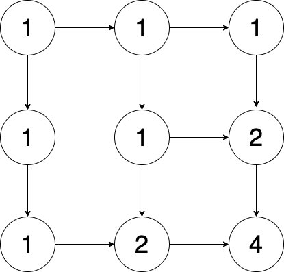 이렇게 더해 나가다 보면 오른쪽 밑에 왼쪽 위에서 오른쪽 밑까지 갈 수 있는 경로의 수가 저장된다.