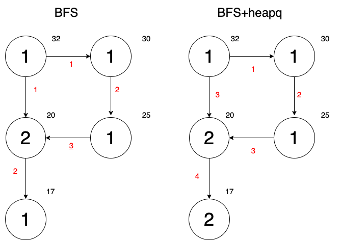 BFS만 쓰면 25에서 20으로 갈 때에 이미 20은 17에 전파를 마친 상황이라 17에 2가 업데이트가 되어있지 않는다. 이는 BFS는 간선의 경로를 같은 거리라고 생각하고 전파하기 때문에 더 가까울수록 먼저 update 되는 상황이 발생한다. 여기서 heapq를 queue대신 사용하고 노드의 숫자(예: 30, 25,17)를 첫 번째 인자로 넣어주면(-로 바꿔서 max heap으로 했다는 가정 하에) 20은 20보다 큰 숫자들을 방문하기 전까지는 update가 되지 않기 때문에 17에 2라는 경로가 저장된다. 그리고 맨 왼쪽 밑에 저장되어있는 경로의 수를 출력해주면 AC를 받을 수 있다.