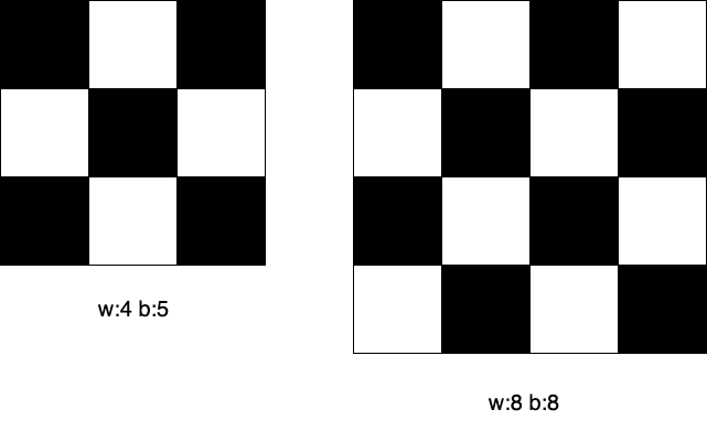 이제 그다음 코드를 보면, for loop으로 1부터 141까지 돌아주는 걸 볼 수 있다. 여기서 141이라는 숫자가 왜 나오냐면 n과 m의 제한이 각각 10000이기 때문에 √20000 ≈ 141.x 하면 최대로 141의 길이를 가진 정사각형을 만들 수 있다. 1부터 시작해서 이 길이를 가진 정사각형을 만들 수 있는지 확인해준다. 여기서 i%2==0으로 홀수 길이와 짝수 길이를 나누어서 생각해주는 이유는 밑에 사진을 보면 알 수 있는데 변의 길이가 홀수일 때에는 타일이 하나가 더 많고 짝수일 때는 똑같다(그냥 편의상 n을 하얀색 타일, m을 검은색 타일로 하겠다).